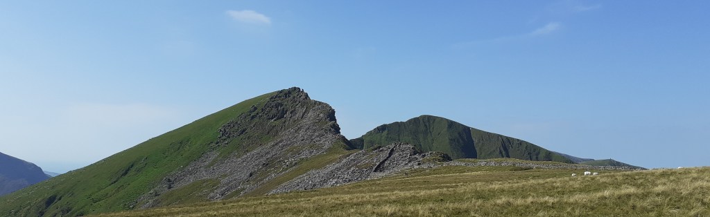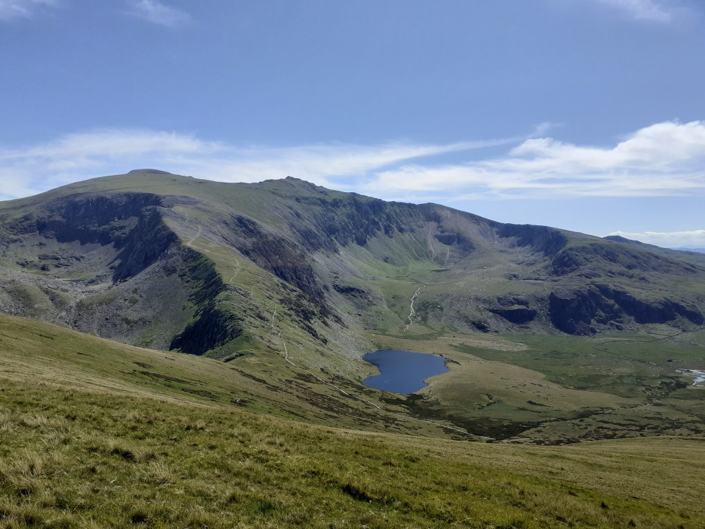 We arrived back in Llanberis tired but exhilarated, bouyed up by some stunning ice cream from Georgio’s and a paddle in the lake to ease our aching feet. And easing them was crucial because the next day was all set to be even better. We’d decided to meet a little earlier as this time we were starting at the Rhyd Ddu train station to head up Y Garn and onto the Nantlle Ridge. Y Garn seems to rise straight up from the banks of Llyn y Gader so it was quite a slog up to the top, but once there we could see the rest of our route for the day, and what a route. A scramble up the ridge to Mynydd Drws-y-coed and along to Trum y Ddysgyl, a beautiful grassy slope leading to a detour to the obelisk on Mynydd Tal-y-mignedd, then down through the edges of Beddgelert Forest back to Llyn-y-Gader and the finish. Back in a previous life (before children) my favourite of all sports was scrambling, so my ultimate aim these days is sky running, and here, for the first time, I got a taste of it. Warm, grippy rock beneath my hands, the sun on my back, the smell of the mountains, my feet moving quickly over exciting terrain. This is my element, and I was totally, supremely happy.
