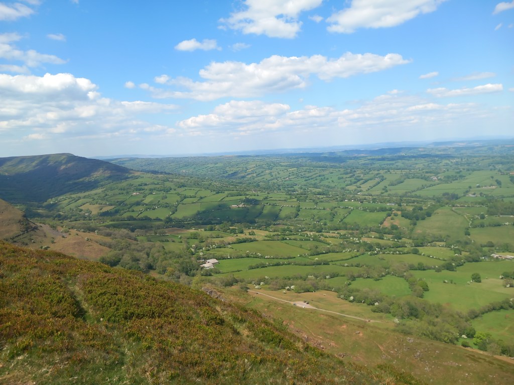 As we sat and ate our lunch in the sunshine the rest of the runners and the walking group all joined us, ready to refuel and regroup. The next stretch would see all of us starting out together, heading across country to hit Offa’s Dyke on the next ridge, then running south for a few miles before we hit our descent path. This section was far busier than the morning as it turned out we were there on the day of the Longtown Mountain Rescue challenge, so the path was fairly full of runners and walkers on the various challenge routes. Fortunately, that section of Offa’s Dyke is so well trodden that the path is wide, easy, and flagged in places, with plenty of space for all.